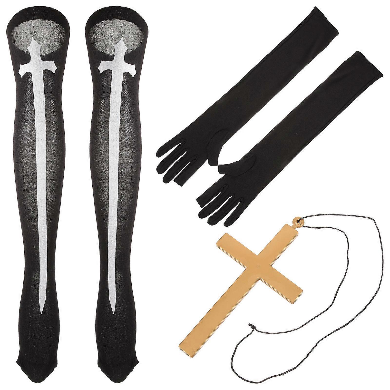 Halloween Costumes Women Fancy Dress Costume Nun Gloves Cross Pendant Necklace Assorted Color Cloth Party Wear 1Set