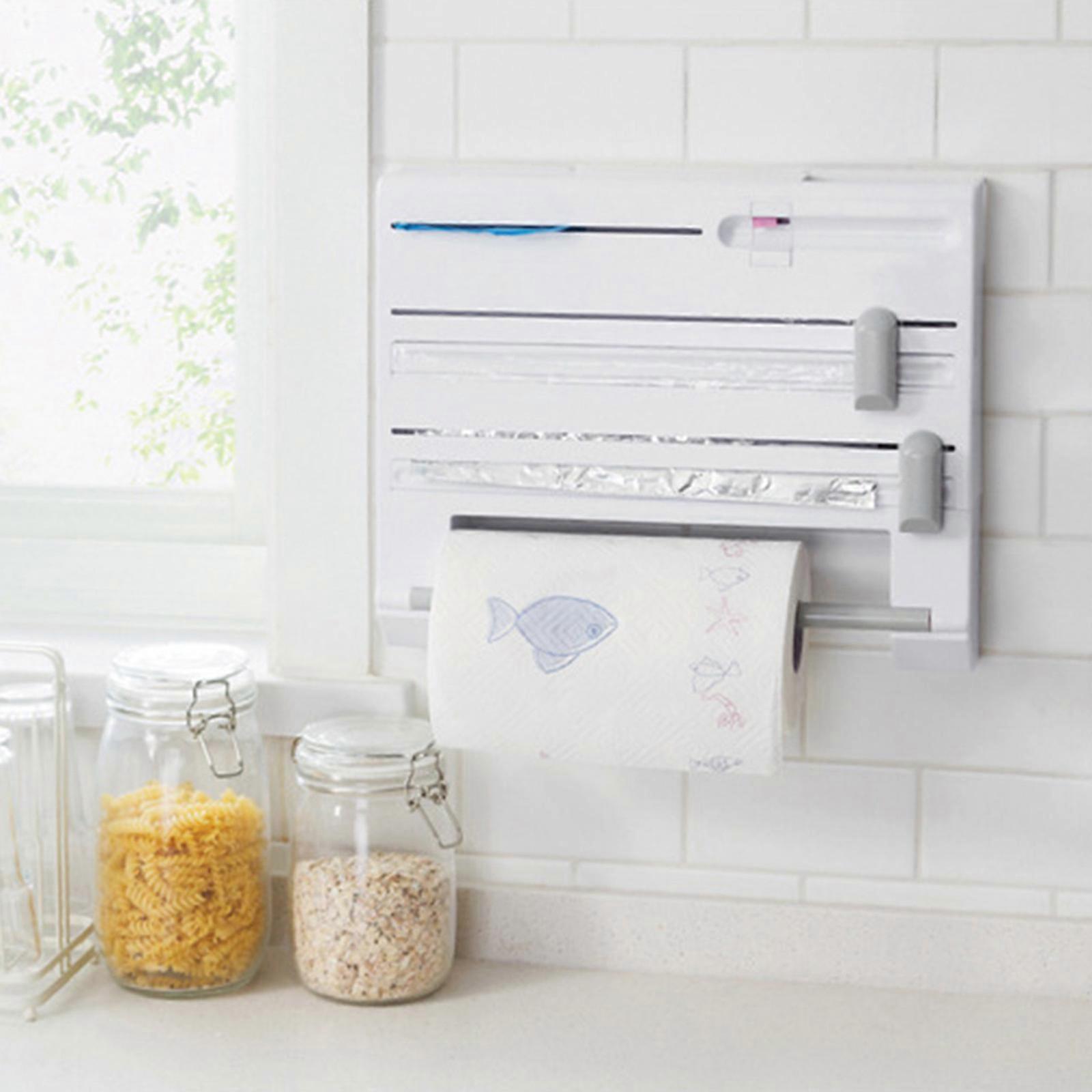 Kitchen Accessories 6-In-1Kitchen Storage Rack,Multifunctional Tin Foil Cling Film Cutter,Plastic Wrap Cling Film Foil Dispenser,Wall-Mount Storage,Ra