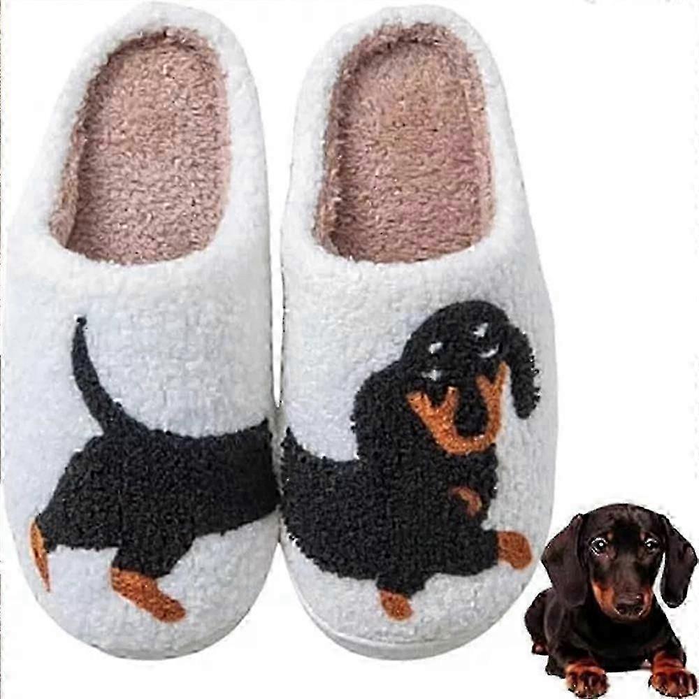 Features: Adorable Slippers: Fall in love with these cute dachshund weiner dog slippers! Featuring plush, fluffy uppers for a super-soft and cozy feel, these dachshund slippers are perfect for lounging around.High Quality Material: Made of ultra-soft and breathable plush, the fuzzy slippers will not only offer you a cozy feeling but also keep your feet warm in cold winter. Non-Slip, Durable TPR Sole: With a high-quality TPR sole featuring anti-slip texture, these slippers provide excellent grip and stability, even on slippery surfaces. Easy Care: Cleaning is a breezesimply toss them in the washing machine (in a laundry bag) or hand wash for a fresh look. No lint or fuss! Perfect Gift for Loved Ones: The playful long ears and sweet eyes of the dachshund design make these slippers a fun, thoughtful gift for family and friends. Cozy and cute, theyll be loved by all! Material: Plush. Sole: TPR. Color: White/black. Package includes: 1pair* Slippers. Note: 1. Due to manual measurement, please allow a difference of 1-2cm 2. Actual item may have slight color difference from the picture. Thank you for your understanding