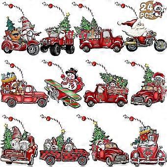 Wooden Christmas Truck Ornaments Red Truck Wooden Hanging Ornaments Wooden Car Crafts With Bead For Xmas Tree Decoration 24 Pieces