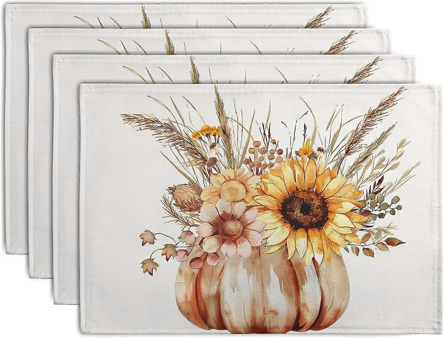 Fall Placemats 12x18 Inch Set of 4 Autumn Harvest Pumpkin Sunflower Flowers Wheat Leaf Table Mat Seasonal Farmhouse Country Washable Linen Place Mats
