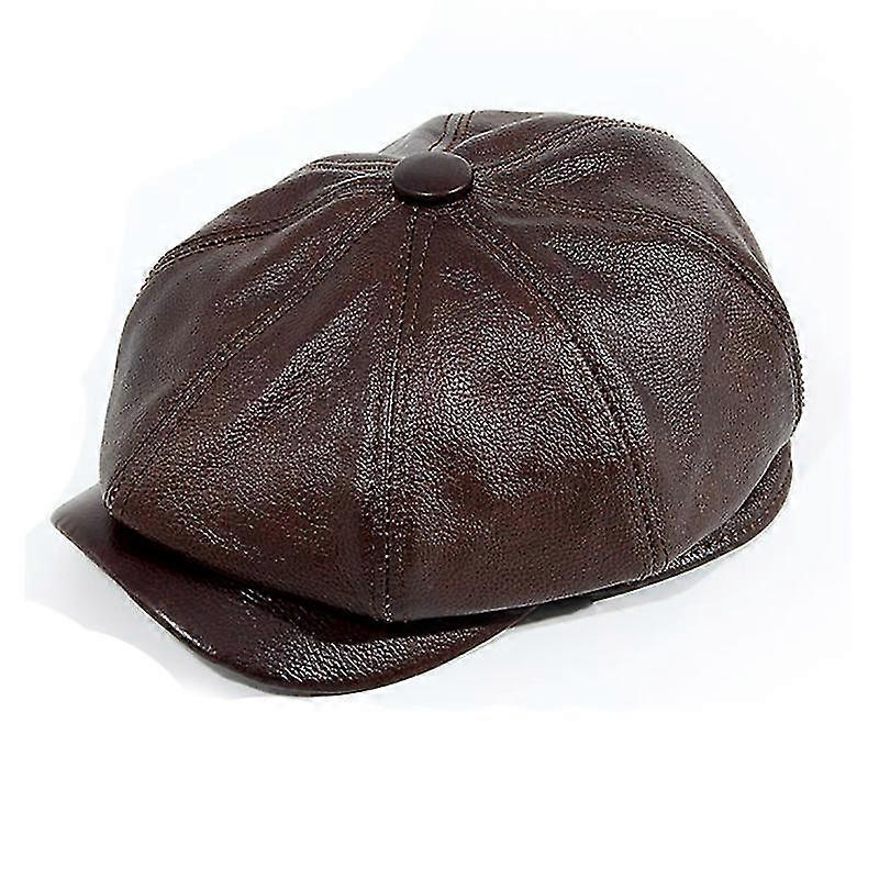 Men Cow Newsboy Cap - Brown Genuine Leather Octagonal Hat Cowskin Autumn Winter British Style Fashion Beret