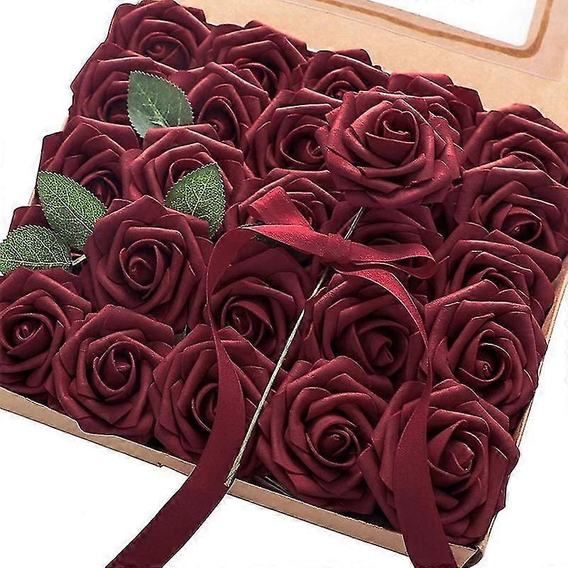 Artificial Flowers 25pcs Real Looking Burgundy Fake Roses With Stems For Diy Wedding Bouquets Red B (haoyi)