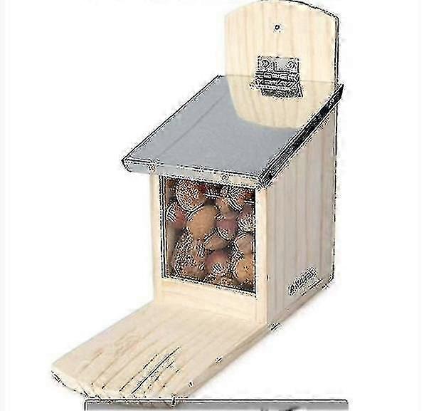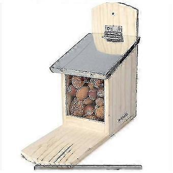 NUT HOUSE: With the Squirrel Feeder, you can offer squirrels a safe environment to eat nuts in the backyard, garden or forest throughout the year. Squirrel feeders give them a source of food apart from your bird feeders. EASY TO MOUNT: Hang the wooden feeder on a tree in an area that is quiet and accessible to squirrels. Enjoy watching squirrels grabbing and eating their food from afar PROTECTION FROM RAIN: The metal roof is made of iron to protect the feeding station from rain, so less moisture enters the wood. FEED EM: Recommended food includes nuts, hazelnuts, sunflower seeds, peanuts, and raisins (food is not included in the delivery). Keep squirrel feeders well stocked at all times to prevent squirrels from straying from their feeders. ANIMAL SAFETY: The transparent plastic front window offers the squirrels a clear view of where they can find their food. The opening has a safety gap to prevent injury to the squirrel if the lid closes while it is eating.