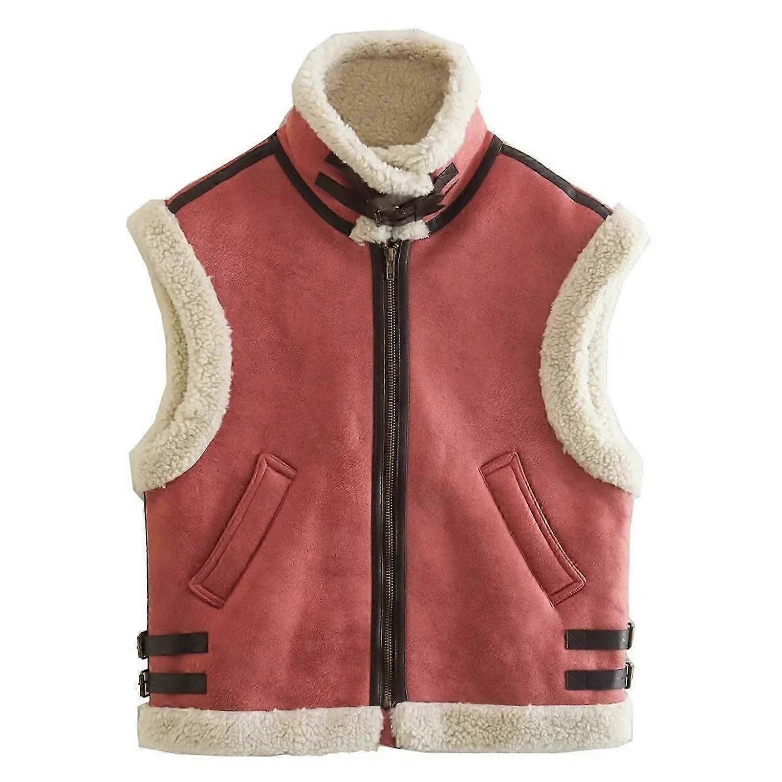 Ladies' Fashionable Sleeveless Zip Up Fleece Gilet Coat with Pockets Faux Suedes Stand Collar Vest Outerwear Jackets milky L