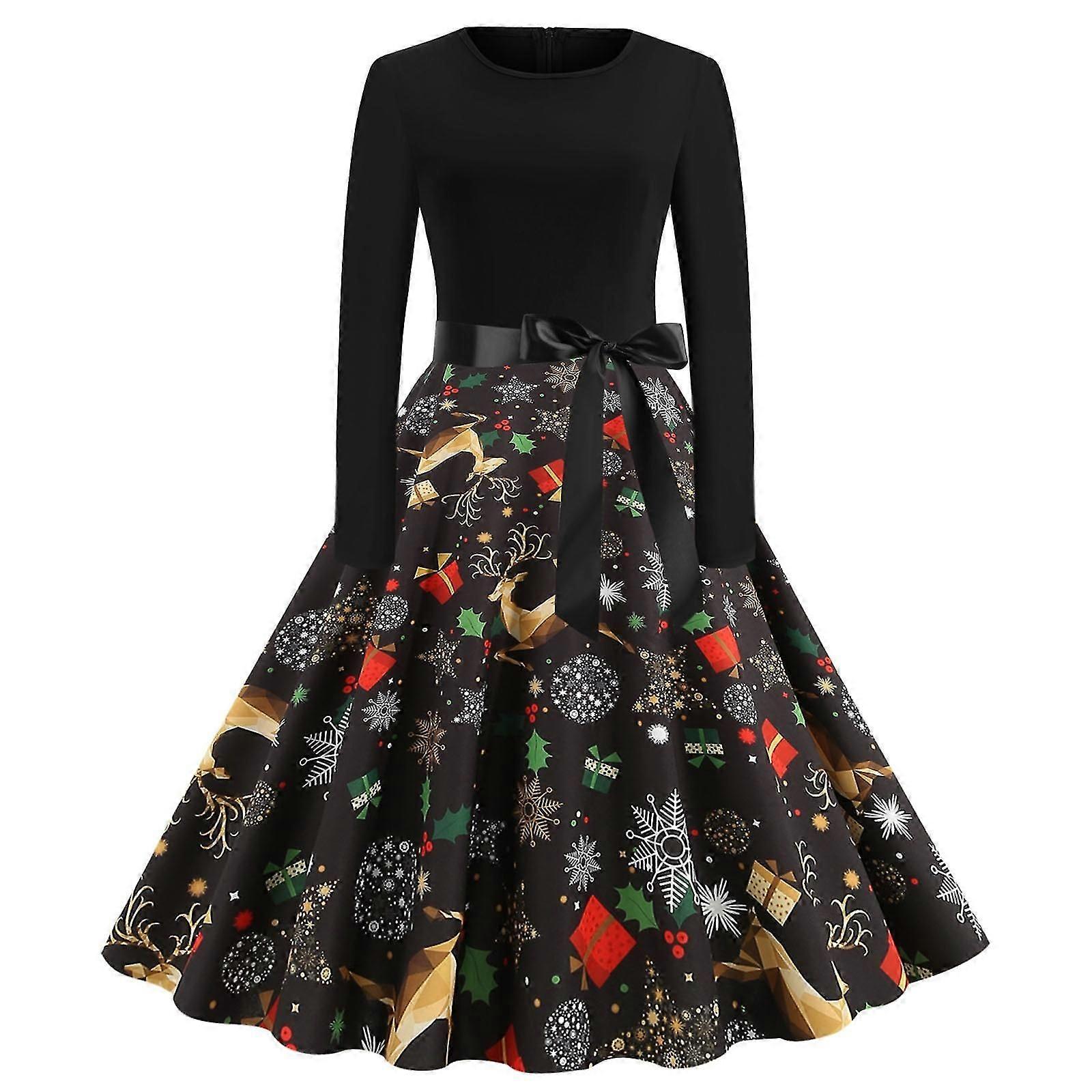 Winter Christmas Dresses Women Vintage Printed Robe Swing Elegant Party Dress O Neck Sexy New Year Long Sleeve Dress Plus Size