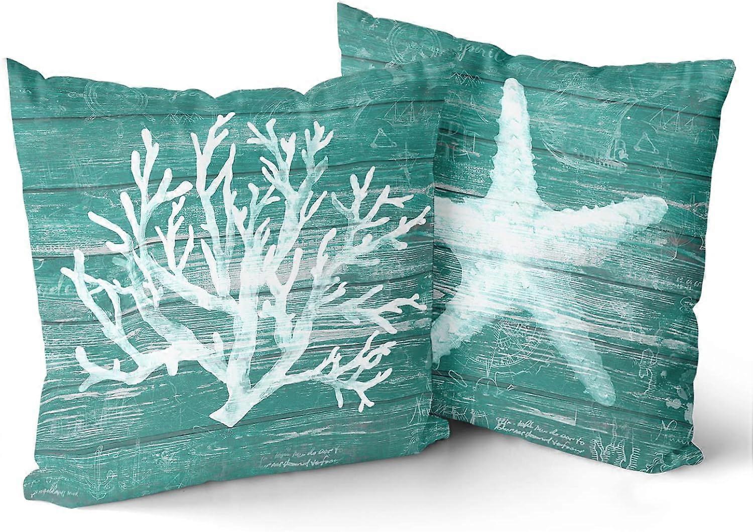 Summer Coastal Throw Pillow Covers Marine Sea World Corals Starfish and Turquoise Green Plank Pillow Case 16x16 Inch Decorative Cotton Square Cushion