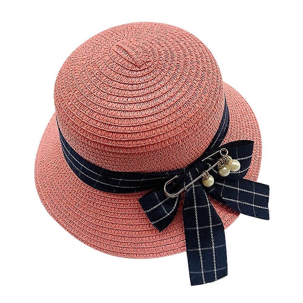 Summer Child Kids Pearl Pin Ribbon Bowknot Straw Hat Round Outdoor Sun Hat(Pink)