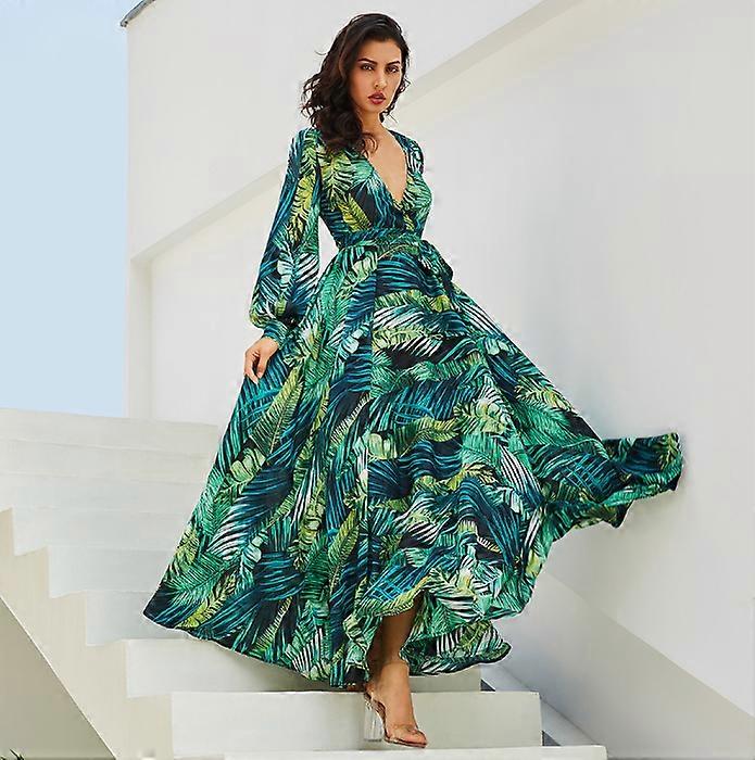 Summer Europe and the United States lantern sleeve sexy deep V printed dress leaf long skirt
