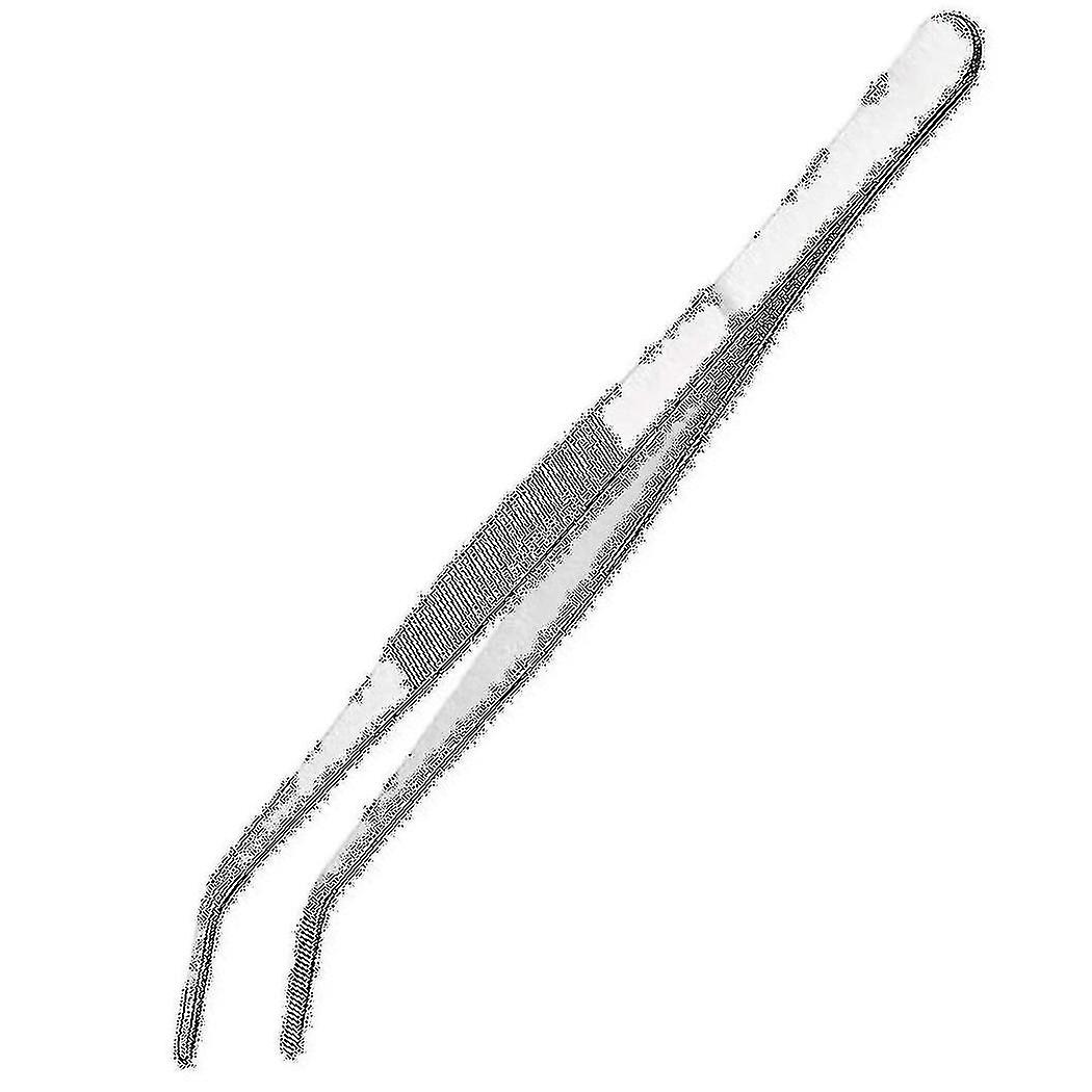 Long multipurpose tweezers with serrated interior at tips for gripping object, tweezers narrow toward and until the tip for removing or gripping small items like fish bones or caviar or for spearing pickles or removing sliced cucumbers from a tray or picking up food or non-food items out of a mixture or reaching and taking object out of a space too narrow to get your fingers through - use even to feed small petsCurved tip enables placement of object from different angles; -serrations on inside of tips give an anti-slip grip on objects; serrations on handle give an anti-slip grip to your hand; slimness of tweezers makes it easy to hold and reach inside tight spaces; shortness of tweezers gives your hand extra control of objects picked up or put downEssential kitchen tool built from a single piece of sturdy, tough and durable stainless steel with comfortable ergonomic shape and tip blunt enough to be safe to Press or even press, with firm hold on food to keep it from sliding out of tongs; slimness makes it easy to hold and reach inside tight spacesGlossy metallic-colored eye-catching food-safe exterior to add color to your kitchen or to serve as reminder to use only for specific foods, whether chicken or meat or fish or saladDelivered with soft plastic ring holding tips togetherColour:SilverMaterial:stainless steelSize:Length 29.5Package Contents:1 * kitchen tweezersOnly the above package content, other products are not included.Note: Light and different displays may cause the color of the item in the picture a little different from the real thing. The measurement allowed error is +/- 1-3cm.