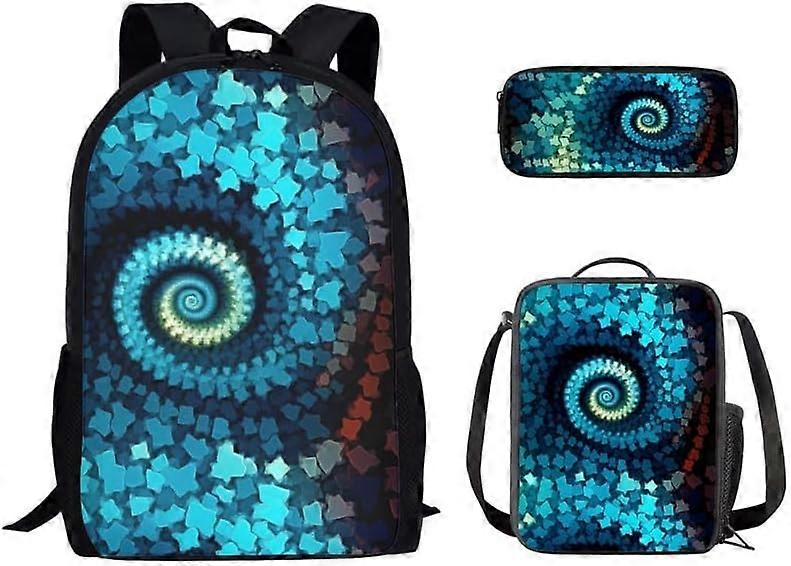 Turquoise Geometric Spiral 17" Kids Bookbag with Lunch Box Fractal Art School Bag for Preschool Toddler Abstract Vortex Large Capacity Backpack Set