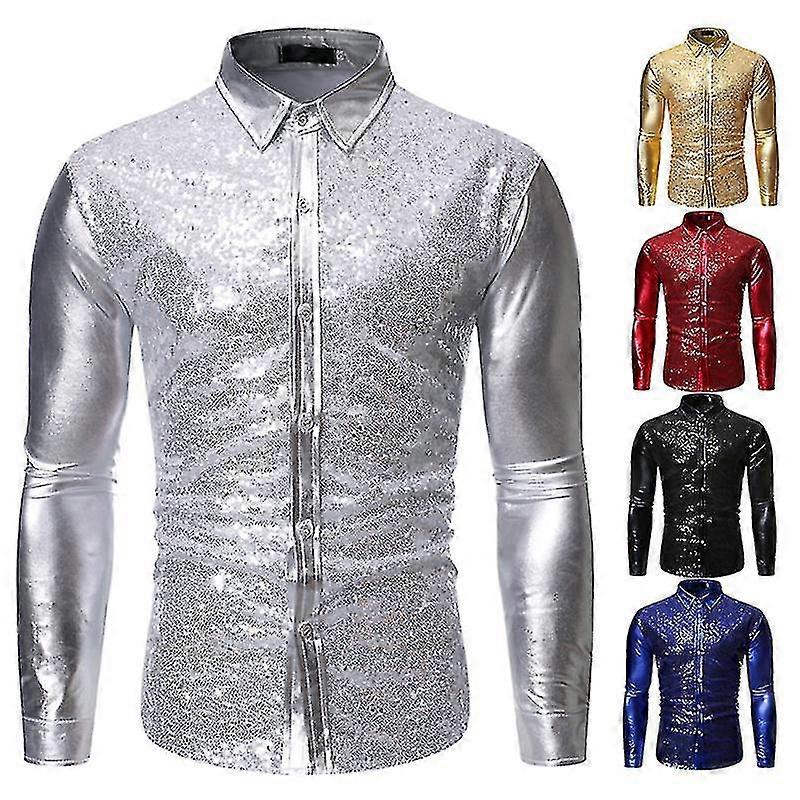 Adults Youth Men's Lapel Long Sleeve Shirt Casual Slim Shirt Cool Sequined Bronzing Dance Shirt Tops