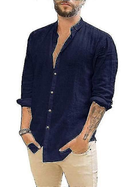 Linen Solid Color Men's Stand Collar Shirts, Men's Casual Long Sleeved Shirt Loose