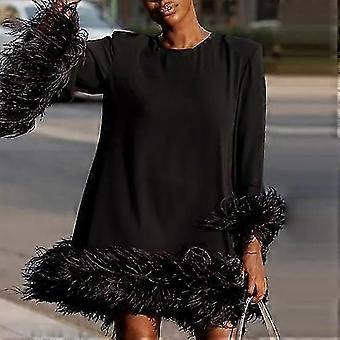 Women Fall Spring Dress Loose Round Neck Fuzzy Faux Fur Decor Solid Color Long Sleeve Pullover H-shaped Above Knee Length Mini Dress