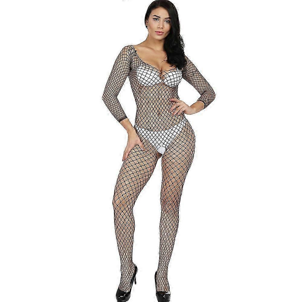 Women Hollow Out Fishnet Bodysuit Sexy Hot Lingerie Long Sleeves Open Crotch Closed Toes Stretchy Full Body Stocking Pantyhose