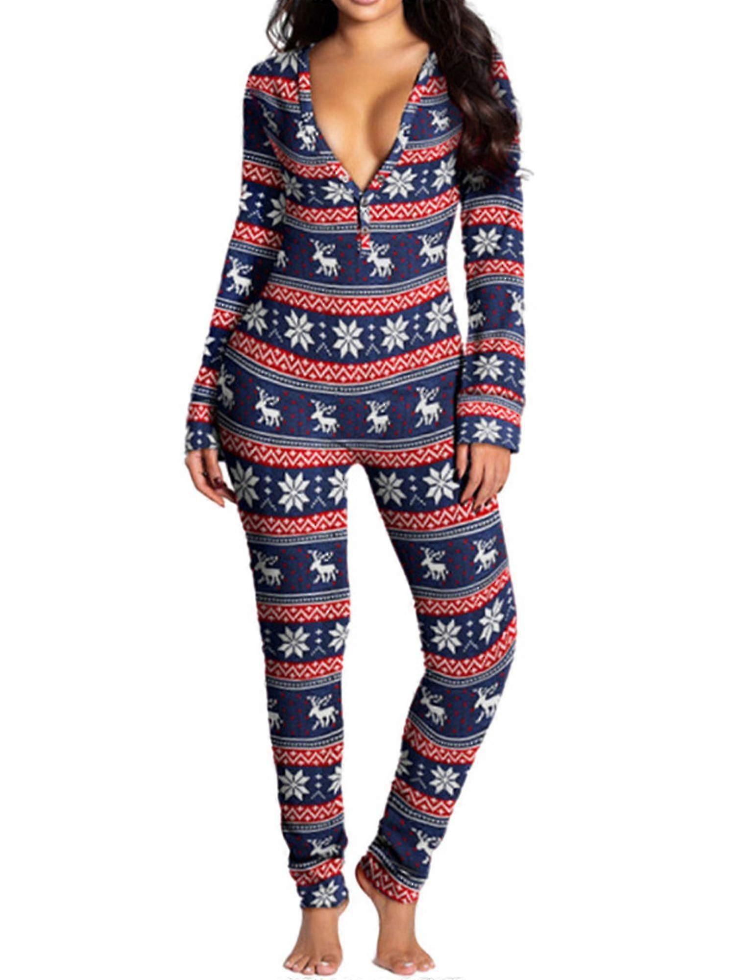 Women's Christmas Printing Bodysuit Long Sleeve Skinny Jumpsuit Casual Rompers