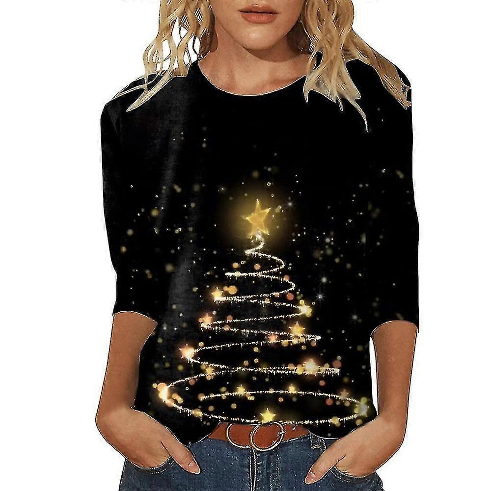 Women Christmas 3/4 Sleeve T-shirt Crew Neck Casual Xmas Shirts Blouse Tops