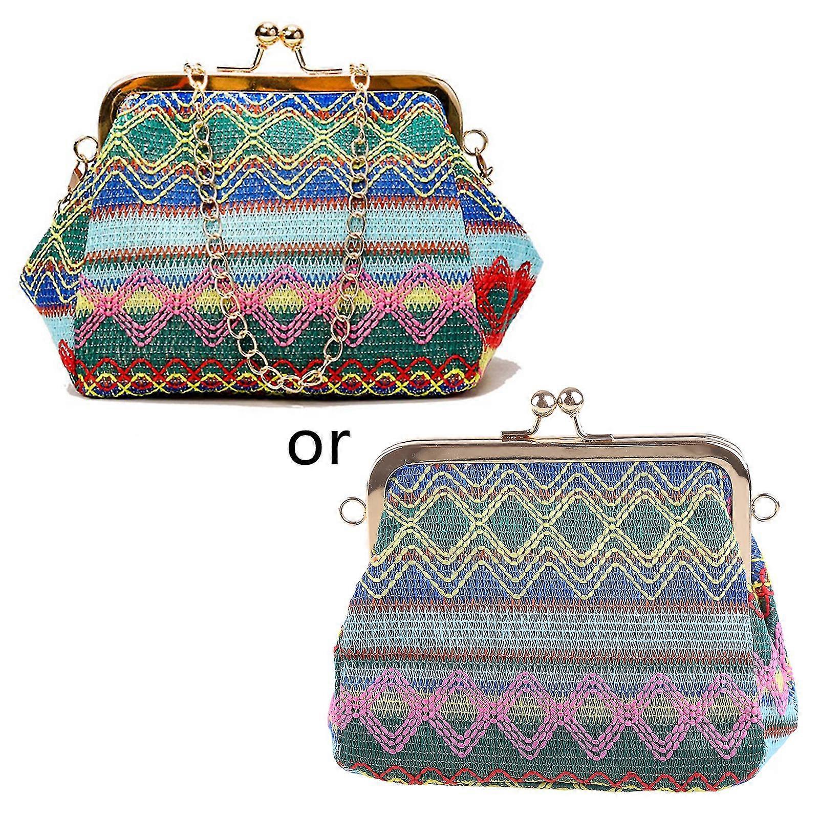 Women Diagonal Bag Straw Weave Handbag Purse Ethnic Style Mini Kiss Lock Bag