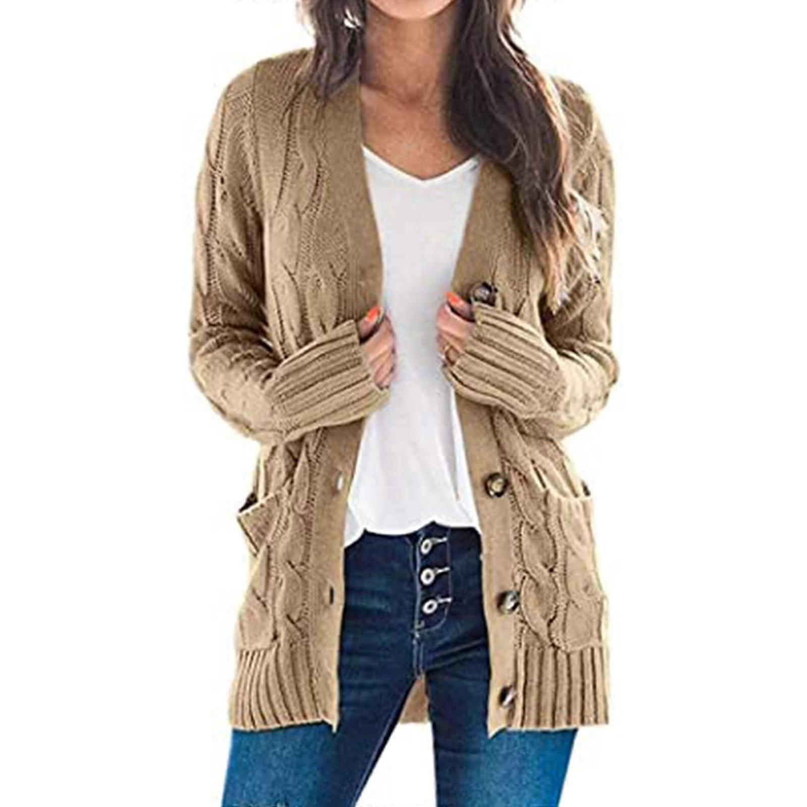 Women\'s Long Sleeve Cable Knit Cardigan With Pocket Casual Coat Solid Color