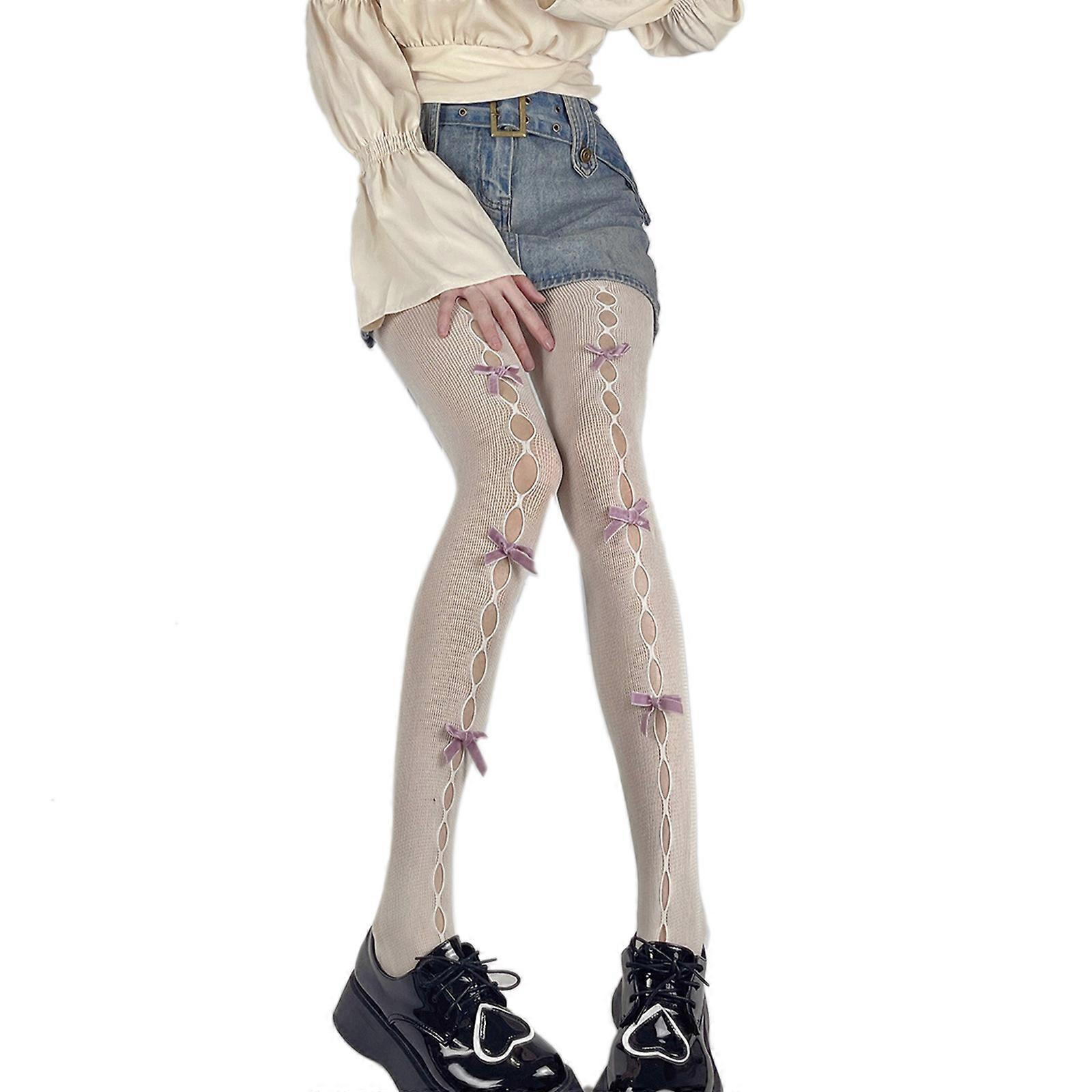 Women Lolita Sexy White Fishnet Pantyhose Sweet Cream Color Velvet Bowknot Hollow Out Holes Sheer Mesh Tights Stockings