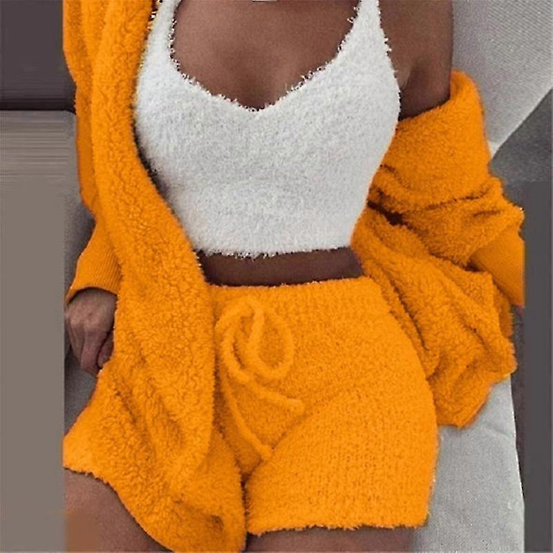 Womens Sexy Fuzzy Warm Sherpa Fleece 3 Piece Outfit Fleece Coat Jacket Outwear and Spaghetti Strap Crop Top Shorts Set