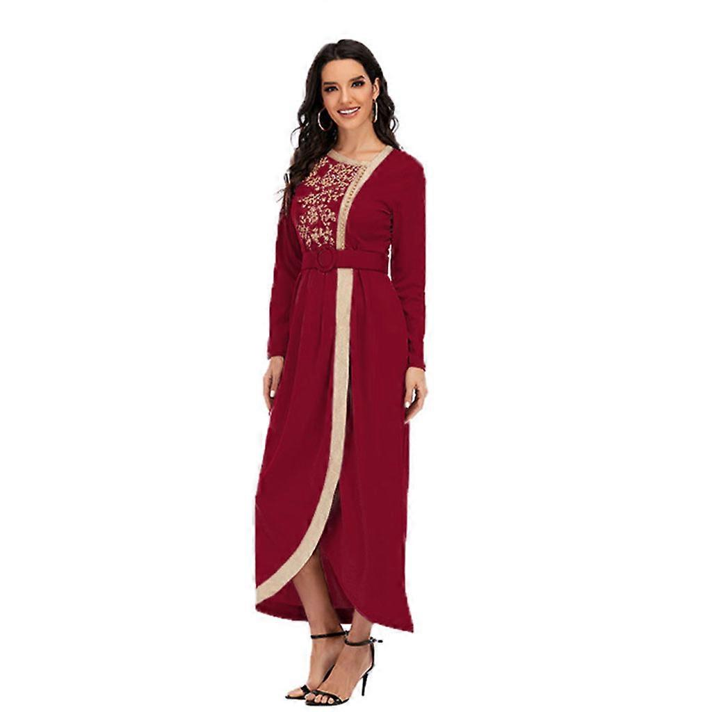 Women Muslim Long Sleeve Maxi Wrap Dress Embroidery Appliques Beaded Islamic Eid Ramadan Long Robe Belted High Waist Abaya Front Slit Dubai Kaftan Gow
