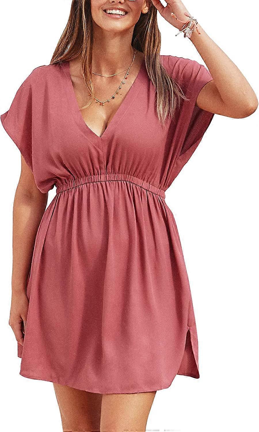 Women's Plunge V Neck Elastic Waisted Cover Up Set Split Short Sleeve Pull Over Mid Length Skirt