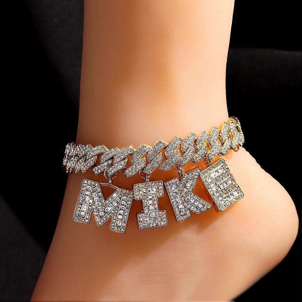 Hip Hop DIY Name Miami Cuban Link Chain Letter Anklet for Women Full Rhinestone Baguette Alphabe Ankle Bracelet Birthday Jewelry