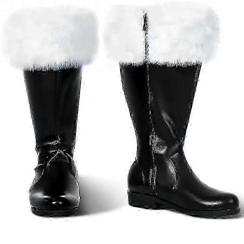 Christmas Santa Claus Boots - Black Leather Shoes with White Plush Cuff for Halloween Cosplay