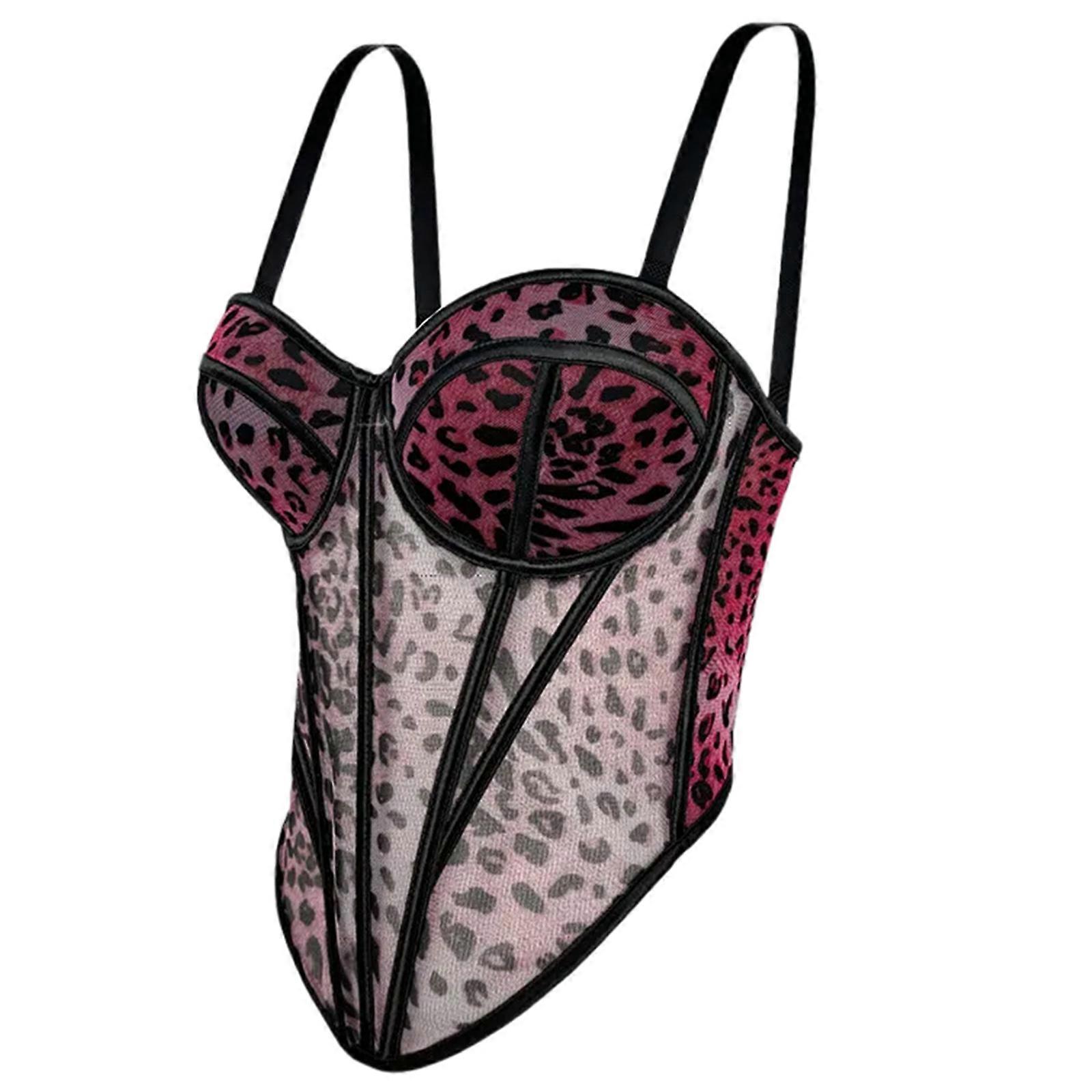 Fashion Leopard Print Mesh Camisole Lingerie Bustier Tops Corset Push up For Women For Dates Parties And Everyday Style rose red XS