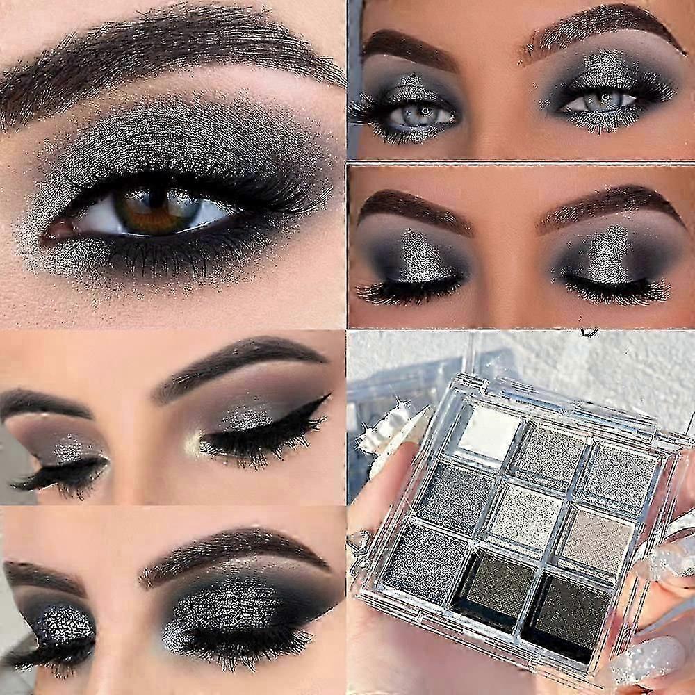 Black Smokey Gray Silver Glitter Shimmer Eye Eyeshadow Makeup Palette, 9 Colors Cool Toned Matte Glitter Eyeshadow Palette Make Up Black Radiance Eyes