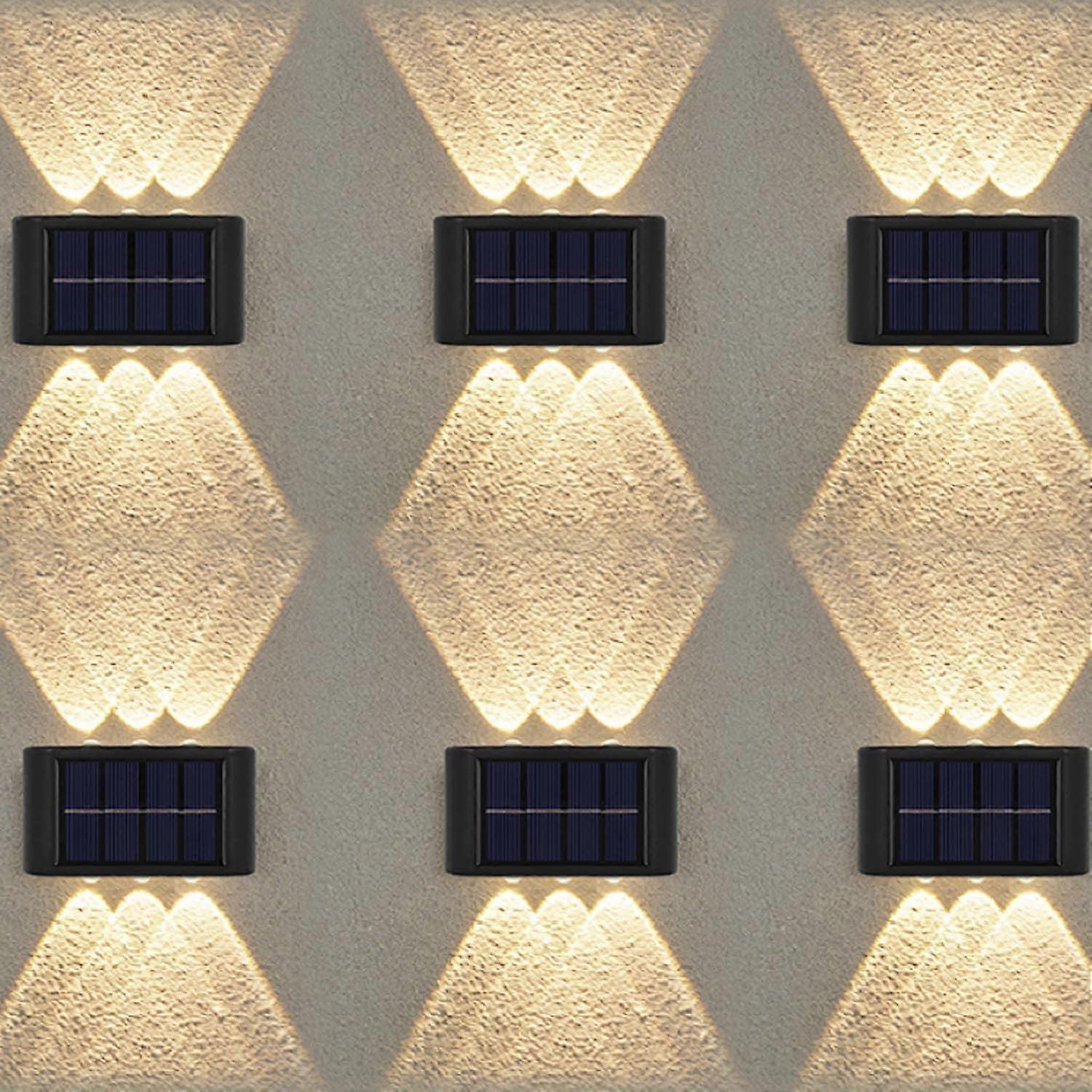 Energy Saving and Environmental FriendlySOLAR POWERED! No cables or batteries are required. The solar wall light stands in a sunny place, it will automatically absorb solar energy, fully charged in 8 hours, working time is about 10 hours, save a lot of electricity energy. Our warm white light is much better for the eyes; 1200mAh Ni-MH battery (lighting longer and brighter); Great decoration for patio, garden, porch, yard paths and walkways. Auto On/OffJust turn on the light from the backside ON/OFF button, the light has a sensitive light sensor, which can detect the light correctly, turn on automatically at night or in the dark . This solar fence light with its bright but not dazzling light creates a warm and romantic atmosphere to make your family, friends and neighbors feel the warmth and love at night. Very suitable for installation in gardens, fences, patios, terraces, pathway, stairway, etc. IP65 Waterproof & Safe to UseThe well-made outdoor solar lights are made of high-strength ABS material to ensure a long lifespan and protect the solar lights from all kinds of bad weather, including snow, rain, and wind. Durable and safe to use, the LED wall lights will not overheat after using it many hours. They are also very bright and is a great garden ornament. Widely Applicable The beautiful light effects emitted from the up and down solar lights will adds a sense of luxury and decoration to your home, especially during festivals. Very suitable for gardens, fence, pathway, yards, wall, stairs, patio, driveways or any indoor/outdoor area that needs lighting. Easy Installation Don't need to worry about confusing wires at all. No complicated structure, simply use the provided screws to install the lights and let the sun do the rest. Therefore, you can complete the installation within a few minutes.