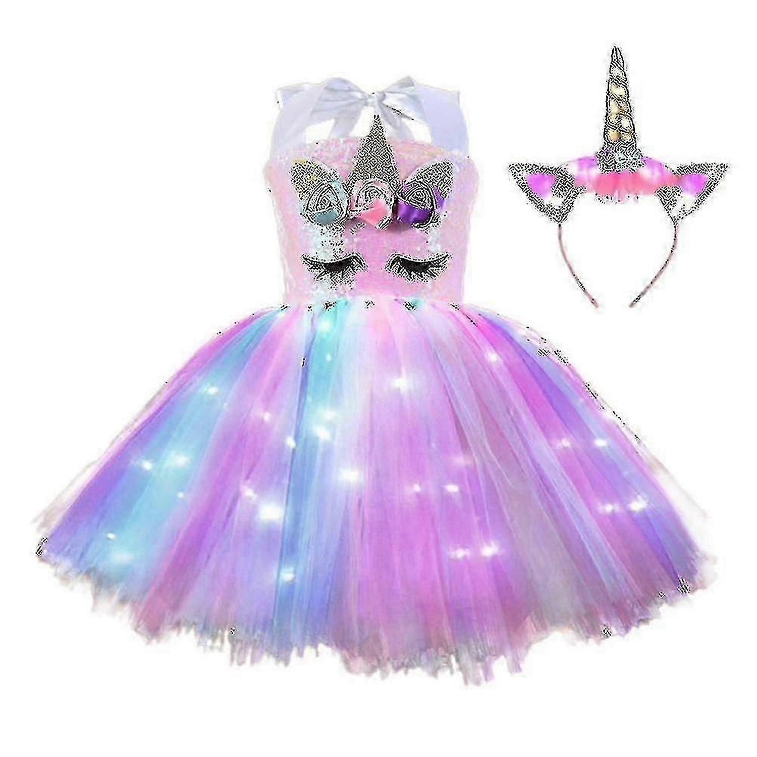 Kids Girls Unicorn Led Sequin Tutu Tulle Dress Headwear Set Fancy Ball Gown Birthday Party Costume Outfit-Good
