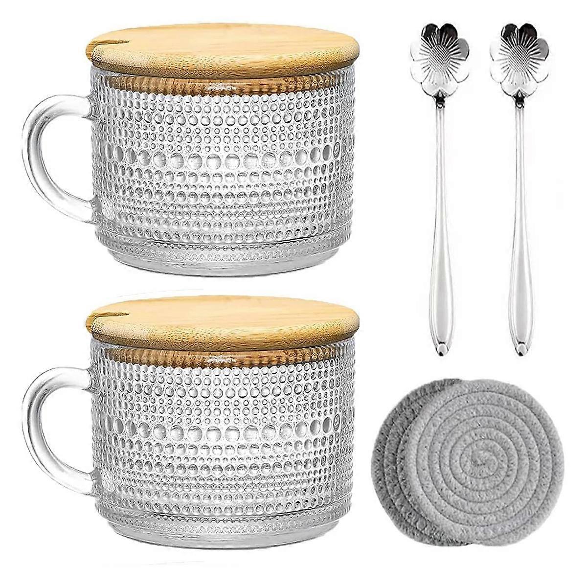 Vintage Coffee Glass Mugs Set of 2, Glass Coffee Tea Cups with Bamboo Lids, Coaster and Spoons,15Oz