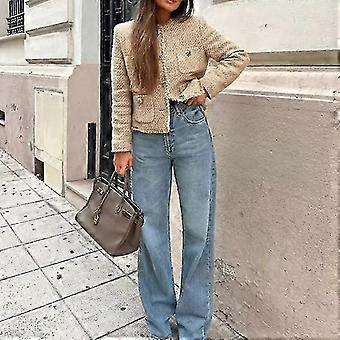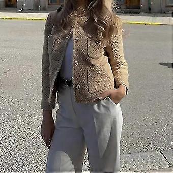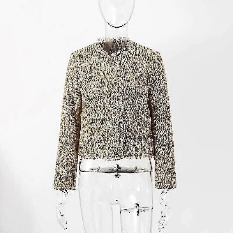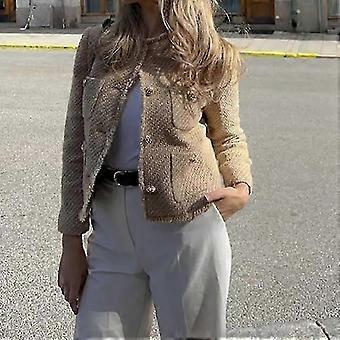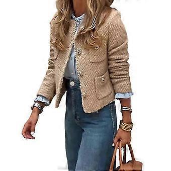 أنيقة المرأة طويلة الأكمام زر المتوترة اقتصاص تويد سترة جيب شرابة معطف جيد