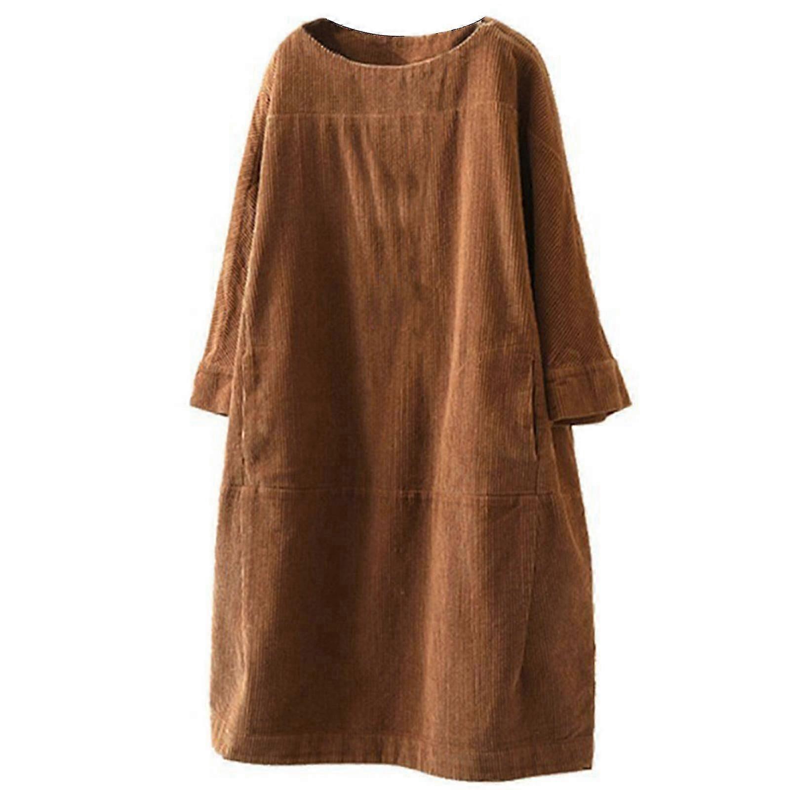 Stylish Women's Vintage Corduroy Casual Shirt Dress Long Sleeve Round Collar Top