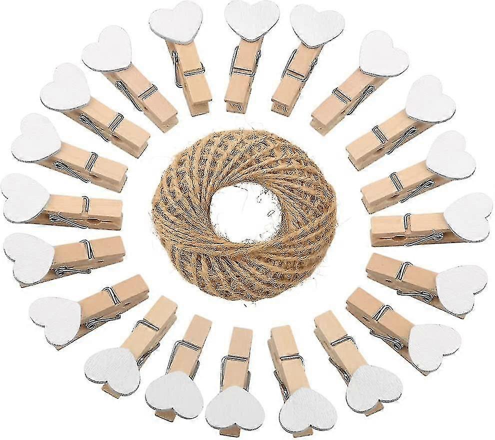 Heart Pegs,100pcs Mini Wooden Clothespins, White Photo Paper Clips With 30 Meters Jute