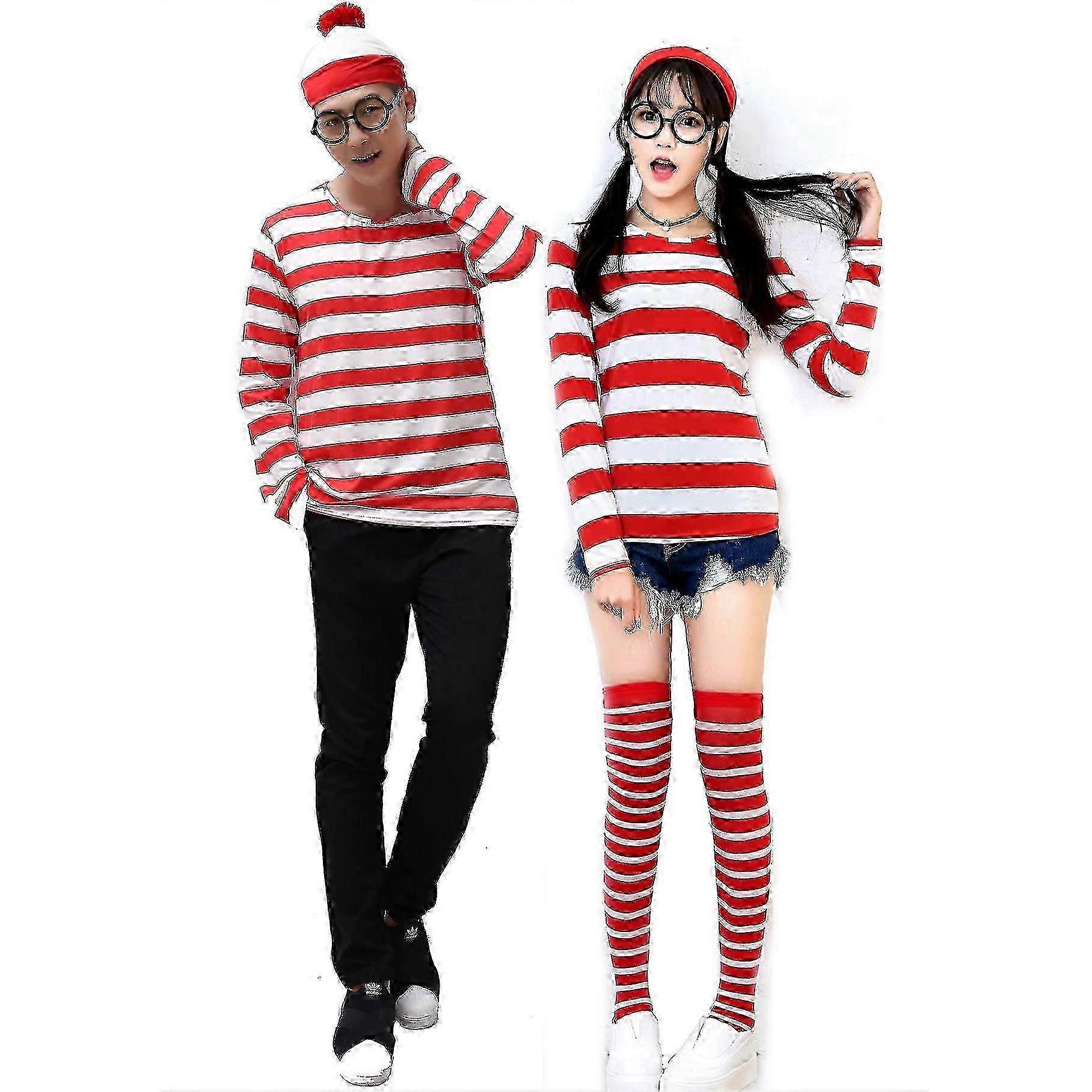 Where's Waldo Now Red And White Stripes Cosplay Costume Adult Men T Shirt Sweater+hat+glasses For Christmas Halloween Party Suit