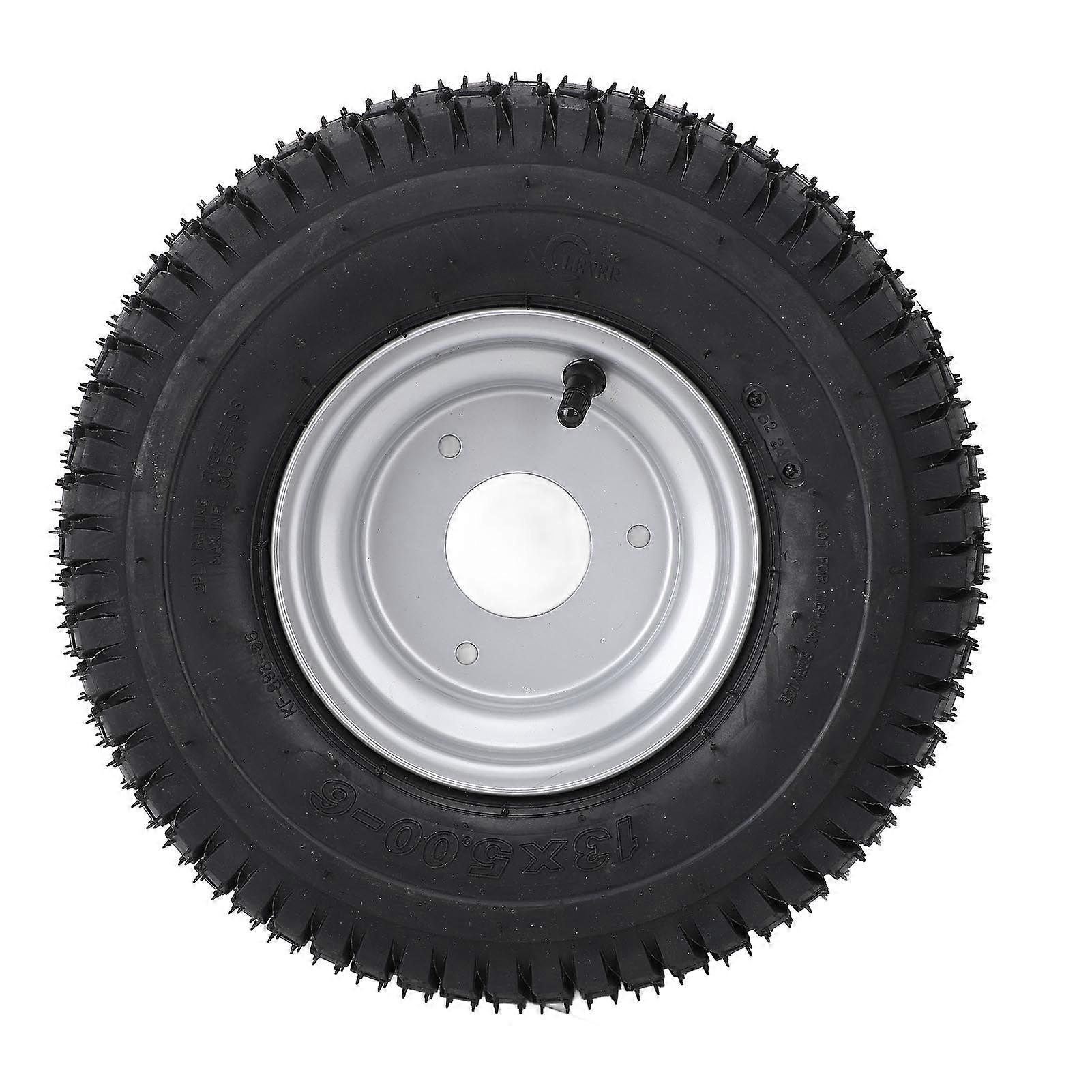 Feature:1. RUBBER COMPOUND: Made from a robust rubber compound, the wheel tire is designed to extend their lifespan while delivering consistent performance. The tread pattern significantly enhances off road handling, providing excellent traction and maneuverability in harsh conditions, including mud, sand, and rocky landscapes.2. WEARPROOF: This wheel tire features a strong layered structure that effectively resists punctures, blowouts, and wear. Its dependable construction ensures outstanding cut and impact protection, making it the ideal choice for tackling off road adventure challenges.3. ADVANCED TRACTION TECHNOLOGY: Equipped with professional shoulder traction technology, this tire ensures exceptional grip during challenging maneuvers and diverse terrains. It significantly enhances control, making it a top choice for ATV and UTV enthusiasts.4. COMPLETE SET: The 6 inch vacuum tire is designed with anti slip and puncture proof features and comes with a matching silver aluminum alloy rim. This tire provides an easy replacement for your old, cracked tires, elevating your racing style in the process.5. VERSATILE USE: Compatible with 6 inch wheels, this tire is ideal for a variety of vehicles including ATV quads, off road vehicles, golf carts, mini bikes, and lawn mowers, ensuring widespread usability across different applications.Specification:Item Type: Wheel Tire with RimMaterial: Aluminum alloy + rubberSize: 6 inch, 13x5.00-6; 13/5.00-6Placement on Vehicle: Front Wheel, Rear WheelInstallation: Secured by bolts; M8x3Fitment: Fit for ATV Quad Off Road Go Kart Golf Cart Mini Bike Lawn Mower with 6 inch wheels (Check your original wheel model carefully and make sure it is consistent before buying).Package List:1 x 6 Inch Tire with RimNote:1. Before purchasing, please carefully check your original tire model and make sure it matches our tire model. 2. We recommend purchasing two or four tires at the same time to avoid uneven left and right height of the vehicle.