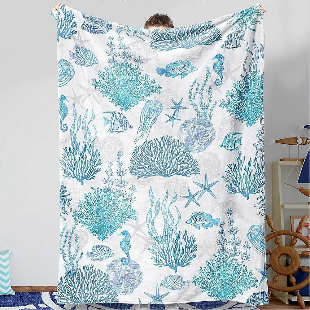 Beach Blanket Nautical Coastal Throw Blanket Blue Ocean Themed Throw Blanket Starfish Seashell Coral Blanket Summer Lightweight Flannel Fleece Throw B