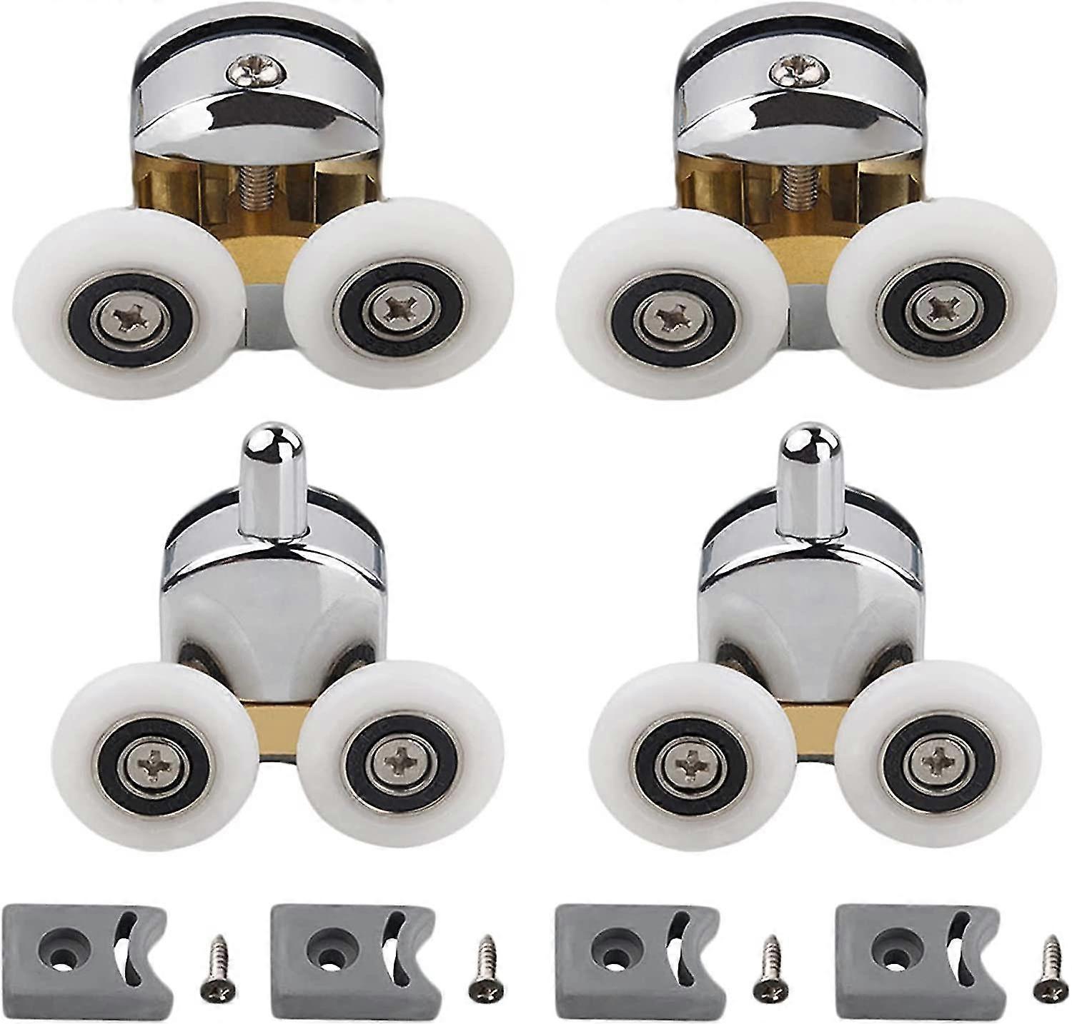 Shower Door RollersSet of 4 shower door rollers. 25mm diameter bathroom DIY spare parts (2 upper rollers and 2 lower rollers), each wheel comes with a bumper and a stainless steel screw. Perfect Experience Material of sliding door rollers: High Quality Nylon Wheel + Copper Core Shaft, Low noise, elegant performance and rolling smoothly, Suitable for 4-6 mm glass thickness. Exact sizeInstallation kit shower door Roller diameter 25 mm. Wheel thickness: 5mm, shower door thickness: 4-6mm, glass mounting hole: 12-14mm. Easy to useReplacement shower door roller easy to slide, easy to install and use, with these sliding door pulleys, the shower door will glide like butter. Super FunctionShower door rollers suitable for most bathroom stalls. shower, shower cabins and steam cabins.