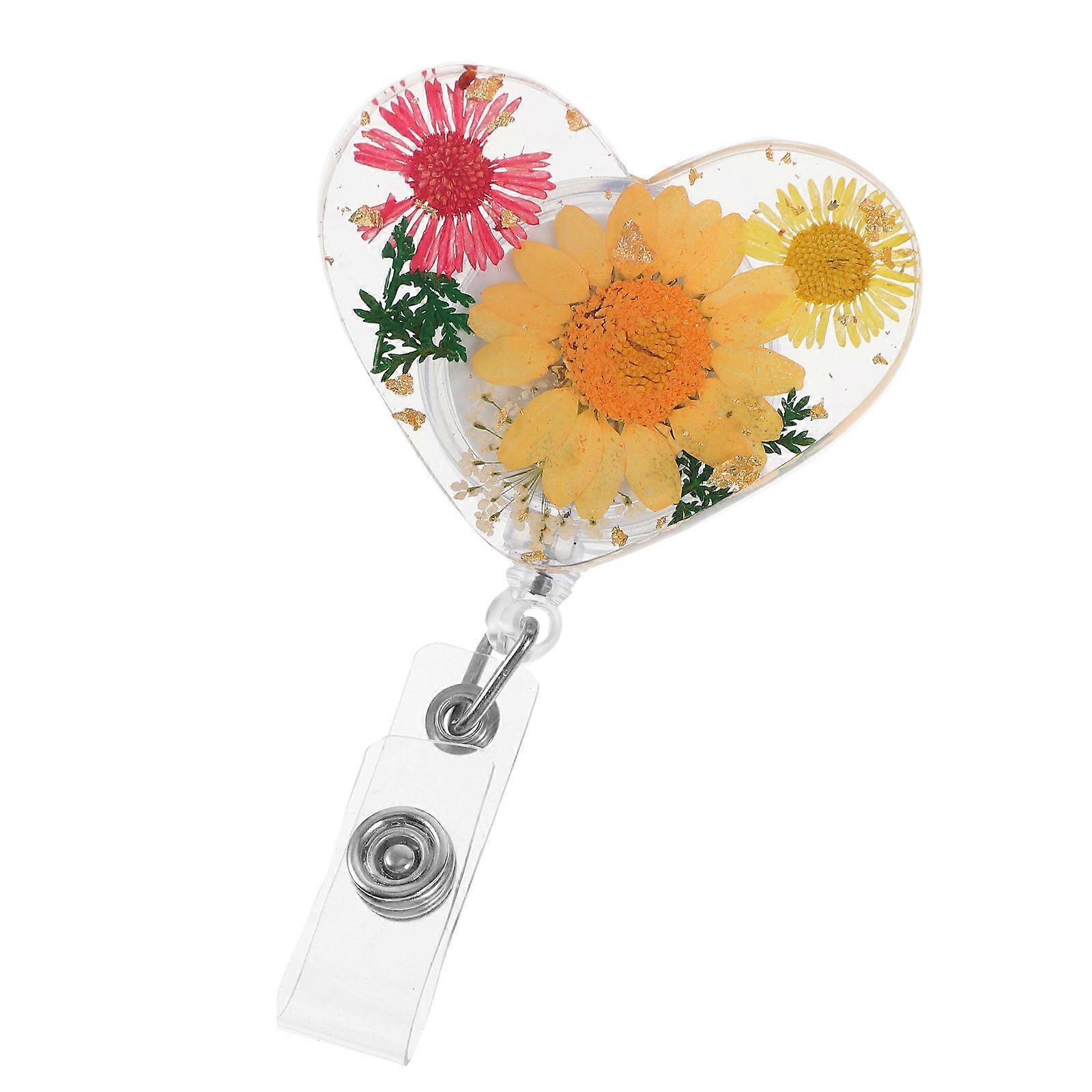 Heart Shaped Dried Flower Badge Reel Lightweight Retractable ID Holder with Clip for Nurses, Teachers, and Medical Staff Decorative Yellow Floral