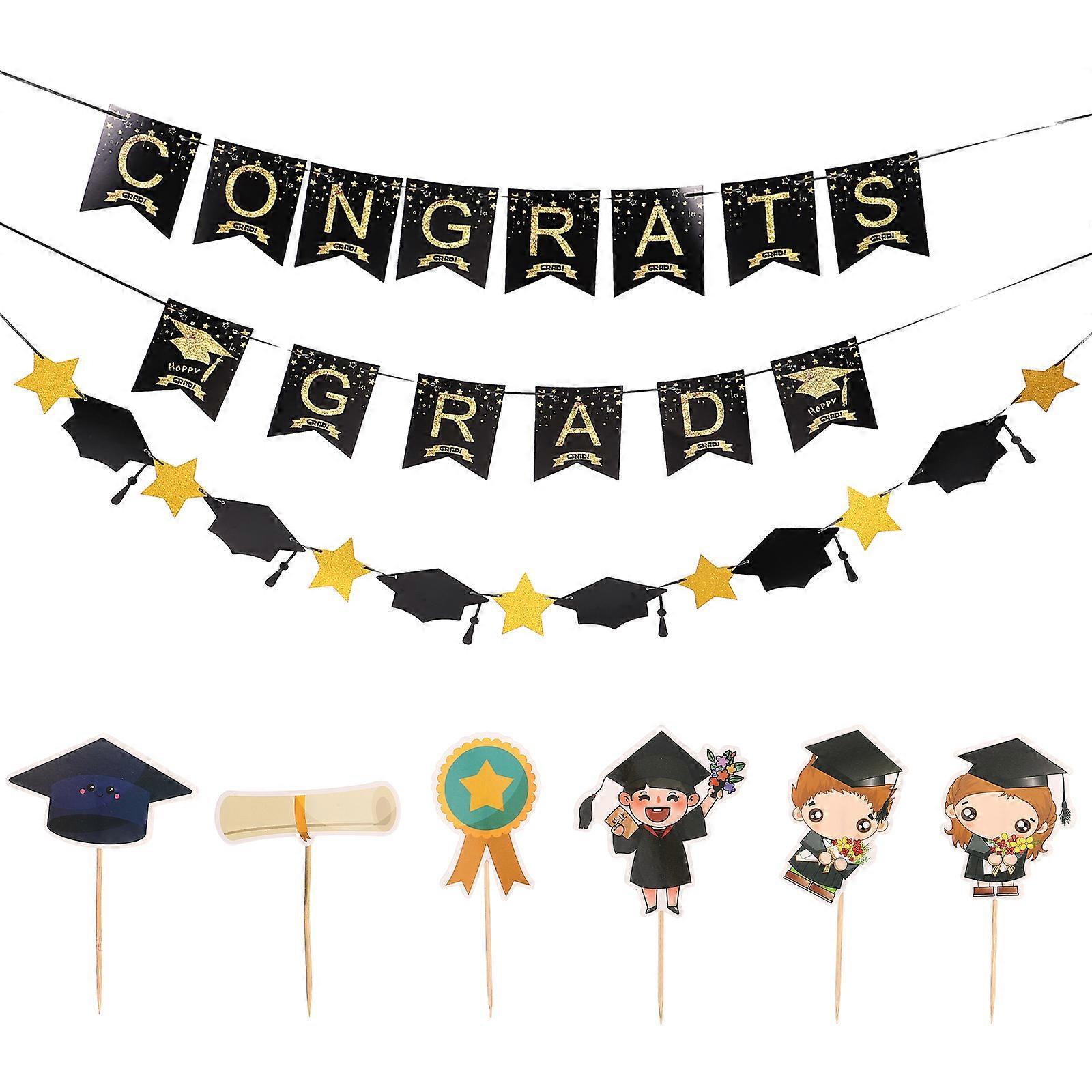 Graduation Decorations Banner Congrats Grad Paper Banner with Cake Picks for Party Decoration 1 Set