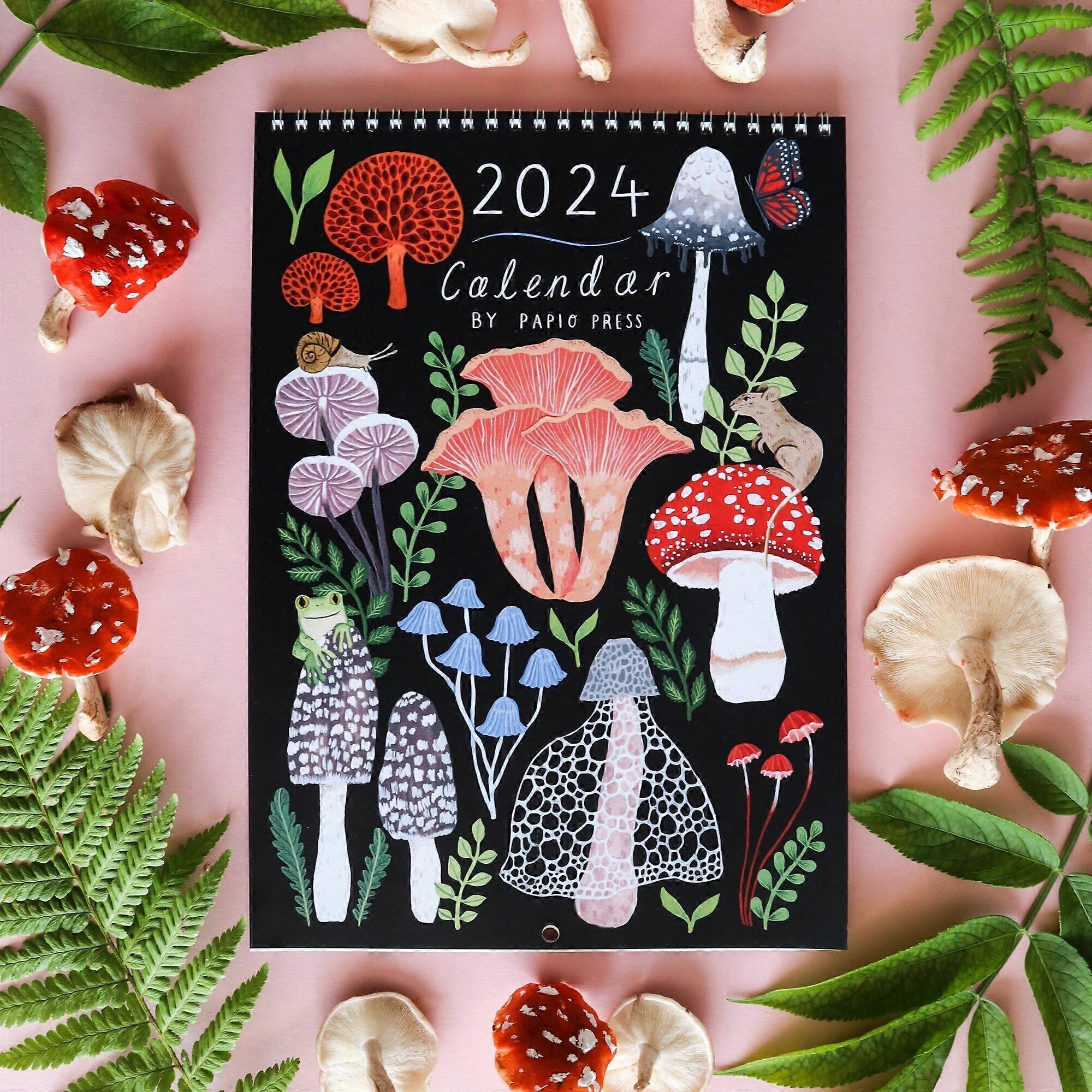 2024 Illustrated Wall Calendar - Animals & Florals Mushroom Calendar Natural Scenery Interesting Plant Calendar 2024 Hangable Monthly Wall Calendar