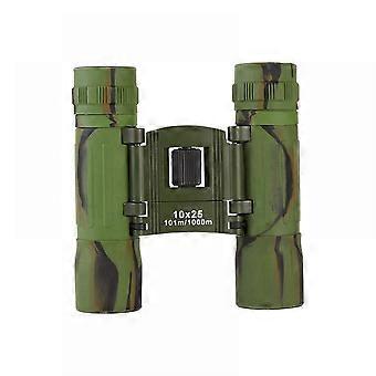 Description: 10x25 Binoculars feature 10x magnification and BAK4 optics creating superior Cla-rity and brightness. There is no double image or violent shaking when viewing moving objects. Aspheric multi-layer coated optics and profession-al BAK4 system ensuring quality image color and ample brightness during observation. The binoculars have a wide, smooth focus knob that makes it easy to focus to accommodate adults and children. Easily focus on the target using the central adjustment wheel. Binoculars, High quality binoculars for a variety of scenarios, including concerts, football, bird-watching, mountain climbing, hiking, traveling and more. Specifications: Material: Plastic Color: Army green Pattern: Camouflage print Magnification: 10 times Occasion: Camping/ Adventuring/ Mountaineering/ Outdoors