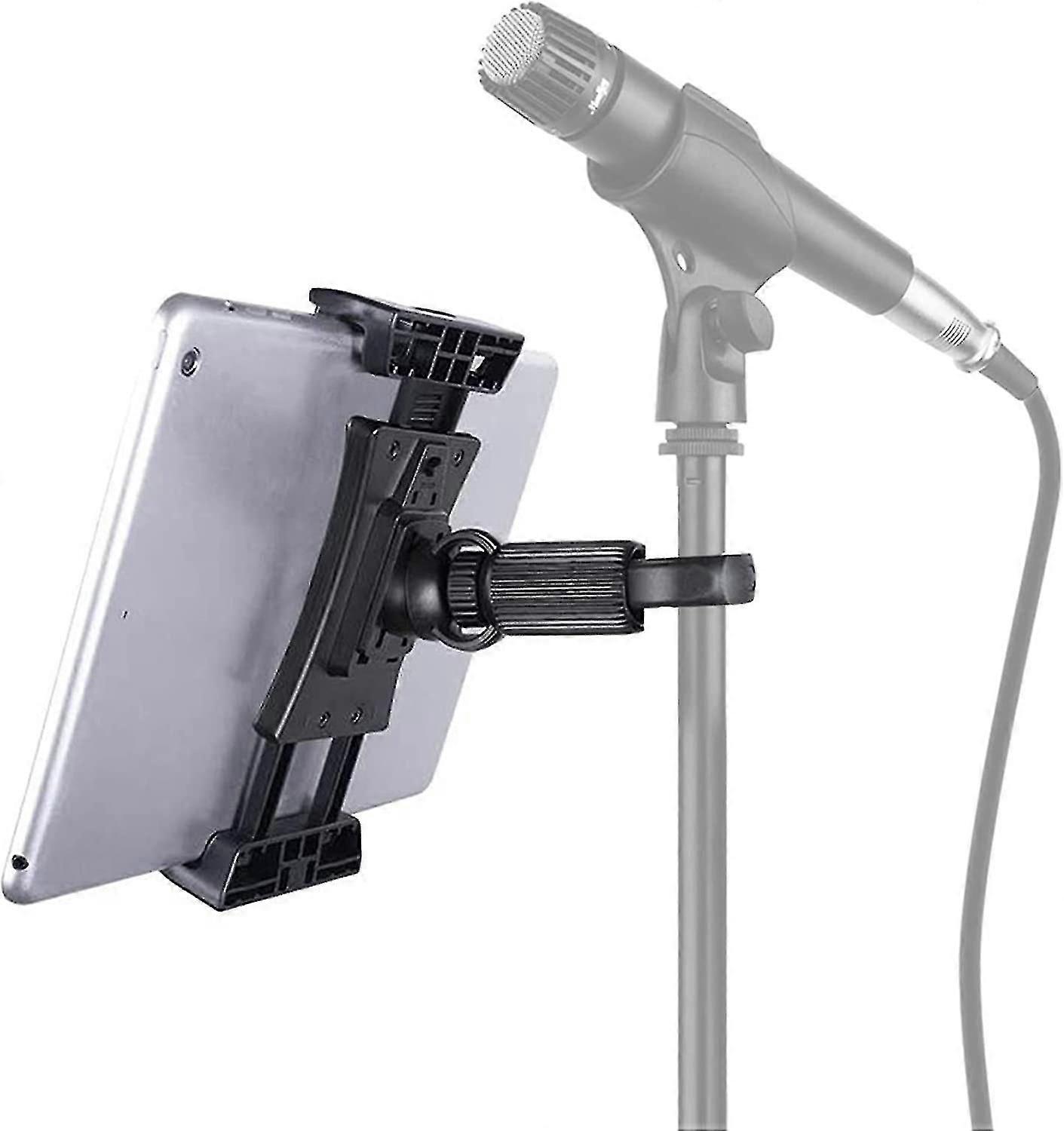 Mic Stand Tablet Holder - Lightweight and sturdy mic stand holder. Suitable for 4.7-12.9" iPad tablets and smartphones. Attaches directly to the pole or to the vertical part of the stand itself. Allows you to play music in any situation.Easy on and off - Comes with everything you need to quickly and easily attach your tablets to any bar with a diameter of 1.5 inches or less. Easily mount your phone on any tripod, monopod or selfie stick with standard 1/4"-20 thread. Installation-free, ready to use straight away. Risk-Free 360 Rotation - Provides nearly infinite angle adjustment and the ability to rotate the tablet from portrait to landscape mode. Great stability for a clear display, without having to contort yourself.High Quality and Durability - Lightweight and durable automotive grade ABS plastic construction. Rubber grip and grooves on the inside of the strap to allow the clip to be firmly attached to the mic stand or music stand. Can also be used on a bike safely. Wide compatibility - Compatible with all major tablets including iPad Pro 12.9", iPad Air 2 and iPad Air, iPad 4, 3, and 2, Samsung Galaxy View, Galaxy Note 10.1, Galaxy Note Pro 12.2, Galaxy Tab 4 10.1, Galaxy Tab Pro 10.1, Galaxy Tab Pro 12.2, Galaxy Tab S 10.5, Google Pixel C, Nexus 10, and Nexus 9, and LG G Pad 10.1, iPhone X / XS Max / XR / 8 / 8 Plus 7 / 7 Plus / 6s / 6 / 6 / 6 Plus. Note: The data are all manual measurement, please allow 1-3cm error, due to the difference of light and display, there will be some color difference, depending on the physical item received.