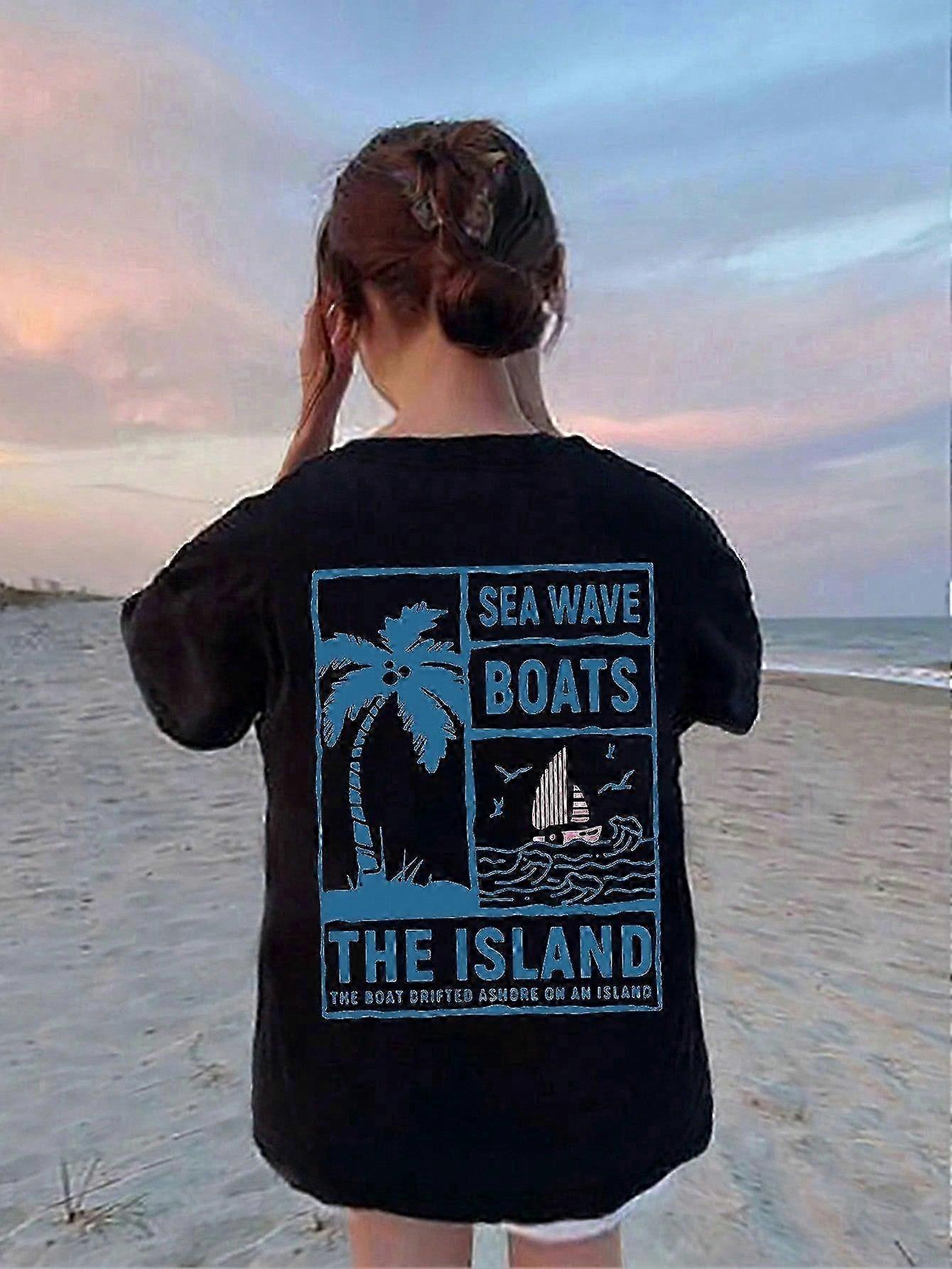 Tween Girl Casual Summer T-shirt - Coconut Tree Print, Round Neck, Short Sleeve
