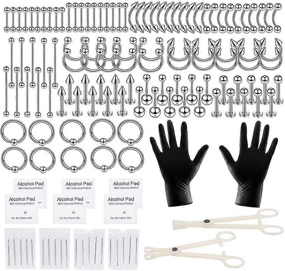 Professional Piercing KitThe 85 Pieces Professional Piercing Kit Includes Everything You Need For Body Piercing Tools (navel, Labret, Eyebrow, Tragus, Nipple, Lip, Ear, Nose, Septum, Cartilage, Helix, Daith, Tongue).high Quality Material - 316l Stainless Steel Body Piercing Is An Ideal Choice. Because It Is Extremely Solid And Durable, Rarely Tarnish And Rust, Provides Lasting COR Retention And Extremely Easy To Clean.complete Piercing ToolsPiercing Tools Includes 10 Piercing Needles (14g, 16g, Each TAMANHO 5pcs),2 Disposable Gloves(one Pair),10 Clean Pad And 65 Piercing Jewelry.Great Kit For Body Piercing Beginners.individual Packing - All Piercing Kit Are Brand New, And Unused.Each Type Of Piercing Jewelry Will Be Packed In Sealed Bag Individual Packing.Safe And Relieved Use.