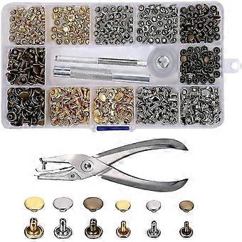 Description Product Description Package content: 240 * leather rivets 1.Excellent Value for Money: 240 Sets of Double Cap Rivets in 3 Colors, 1 x Manual Crimper, 3 x Fixing Tools and 1 Box for 15 Grids, is enough to meet your DIY needs . 2.Matching Rivets: These leather rivets are available in 2 sizes: 6 x 6mm, 8 x 8mm and 3 colors: gold, silver and bronze. Smooth and shiny surface is ideal for your various leather decorations. 3.Convenient tool kit: manual punch pliers and punch rod easy to punch on fabric, leather and punch pliers can also be used for paper, scrapbooking or ticket punching, a necessary tool and quality for school, home and office. 4.Applications: These leather rivets can be used for DIY, such as wallets, backpacks, shoes, clothes, jeans, etc. Comes with a storage box, allows you to find these components quickly and in case of loss of rivets.