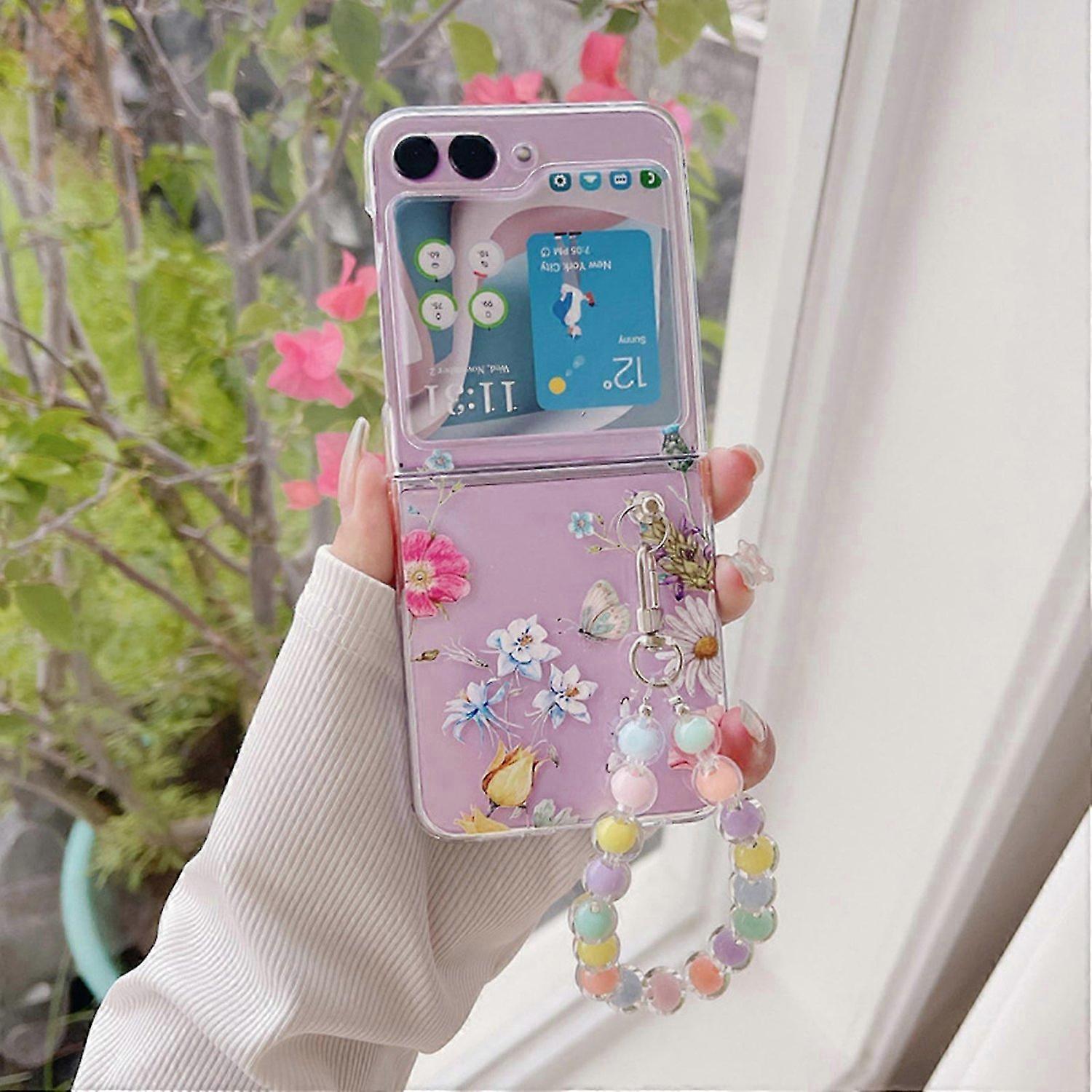 Clear Case for Samsung Galaxy Z Flip 5 with Wrist Strap, Fashion Flower Case Galaxy Z Flip 5, Hard P